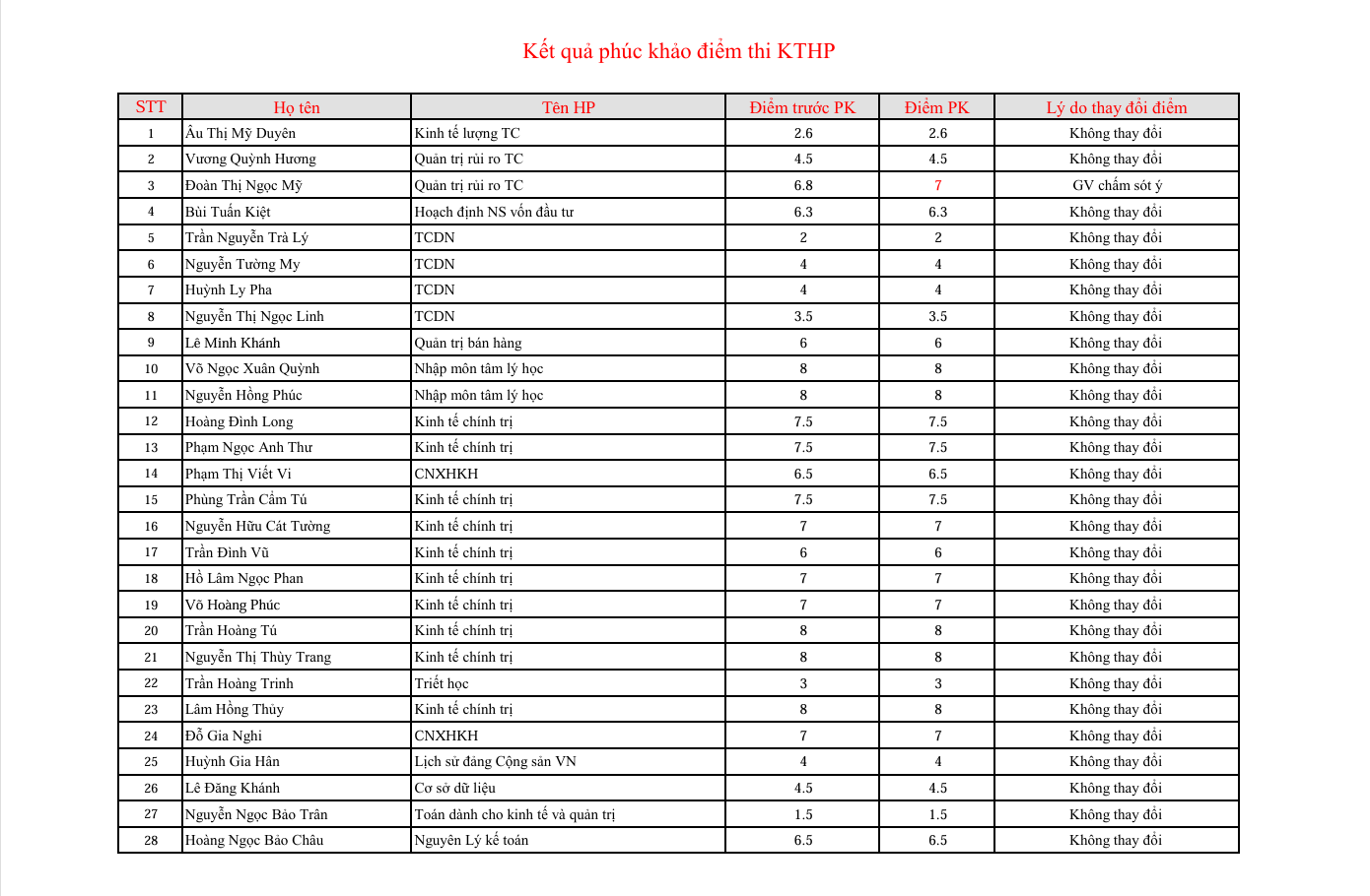 Kết quả phúc khảo điểm thi KTHP (Cập nhật ngày 28/07/2025)