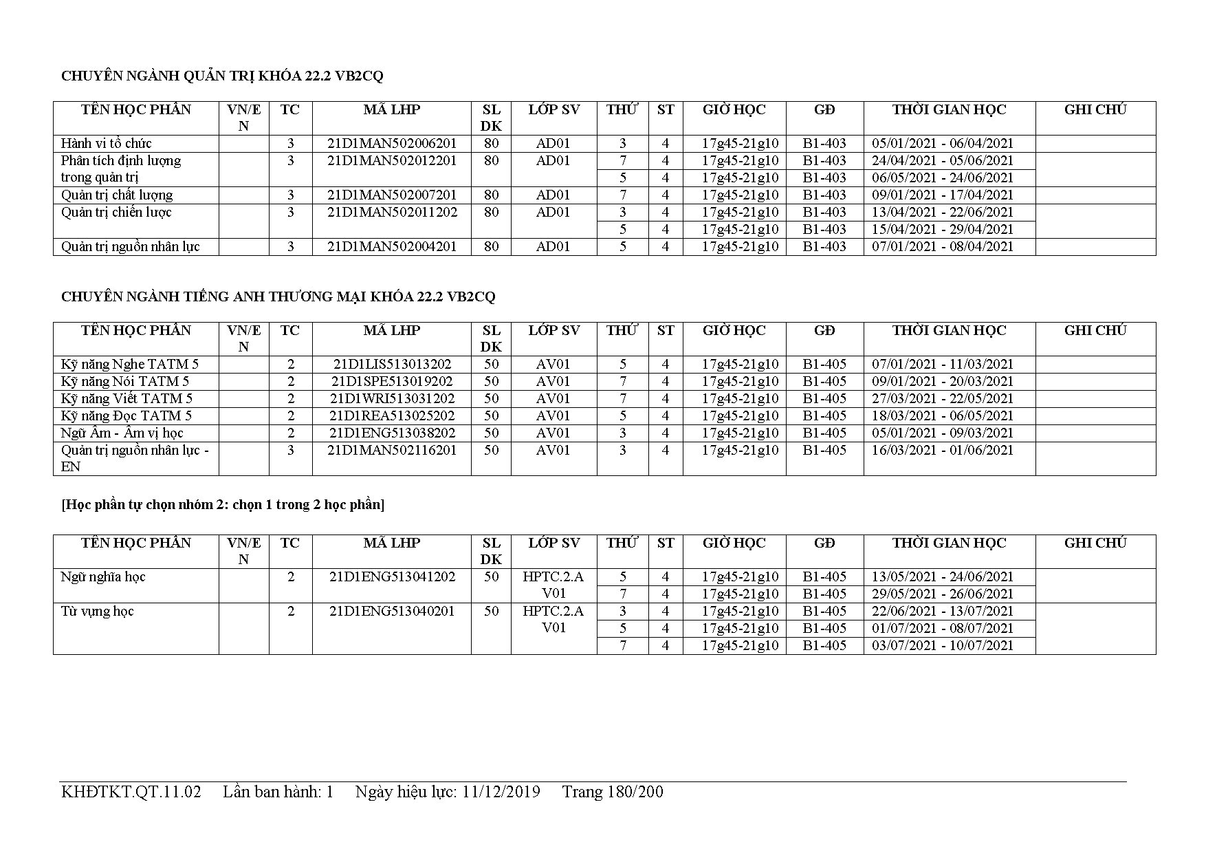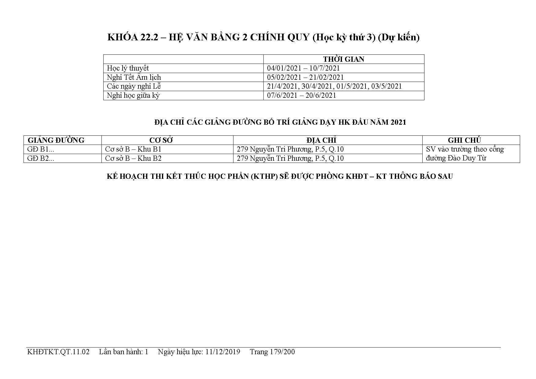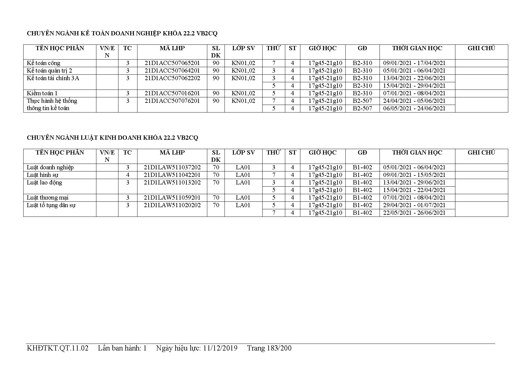 Thời khóa biểu (dự kiến) học kỳ đầu năm 2021_Khóa 22.2 Hệ VB2CQ
